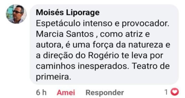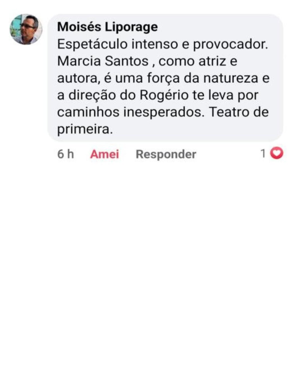 “Fiquei completamente apaixonado pelo texto e pela direção! Atuação magistral! Texto atual, visceral, às vezes divertido, outras pungente… enfim… vida!”