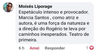 “[...] Essa é um pouco da estrada da profissional, que apresenta um monólogo eloquente, necessário e delicioso. Na ficha técnica tem o iluminador Paulo César Medeiros, o diretor Rogério Fanju, o figurinista Wanderley Gomes e o preparador corporal Édio Nunes. Todos já passaram por essa coluna, são potentes, bons no que fazem. Na verdade, estão além de bons, são verdadeiros profissionais das artes cênicas, nomes que dão ao espectador a chancela de algo, no mínimo, digno de aplausos.