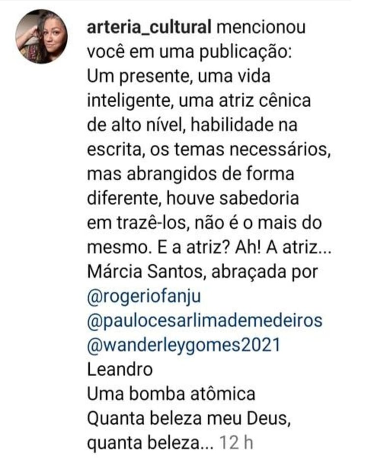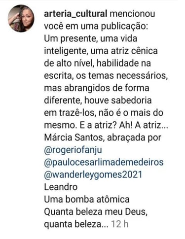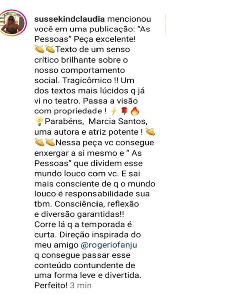 “Ainda estou impactado com o espetáculo. O espetáculo é maravilhoso! [...] É muito difícil fazer monólogo... O teu espetáculo é instigante, é envolvente, ele emociona, você reflete, você ri, tem horas que você praticamente chora...”