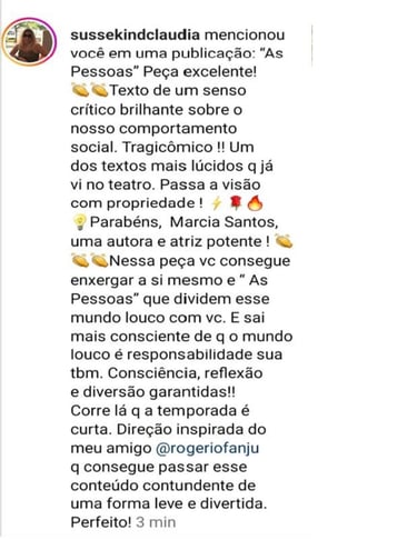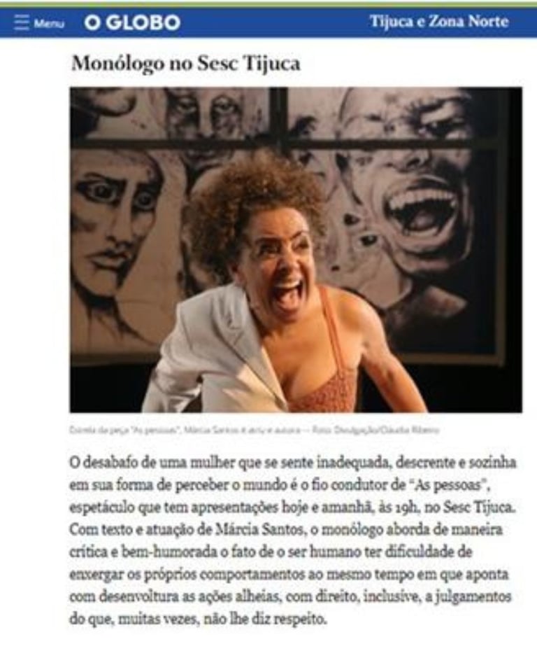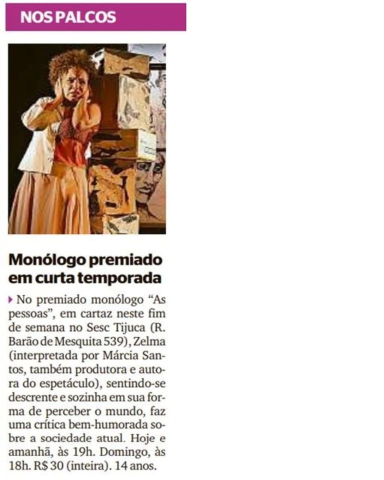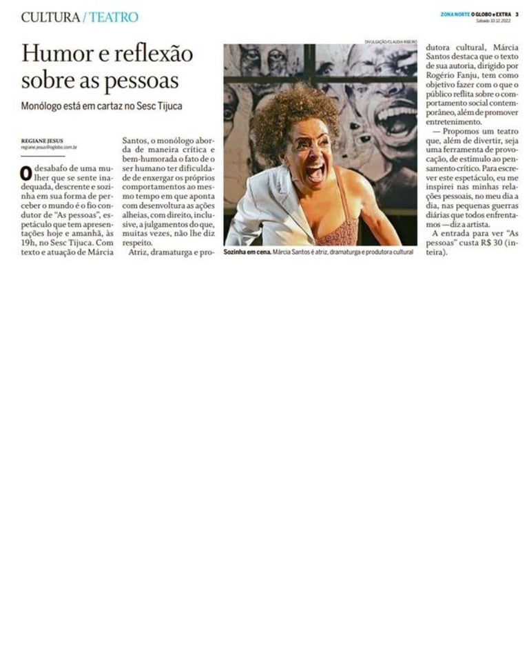 “[...] Alguns textos surpreendem ao cutucar corajosamente os pontos doloridos da alma nacional. É o caso de As Pessoas, texto e atuação de Márcia Santos, sob a direção de Rogério Fanju.”