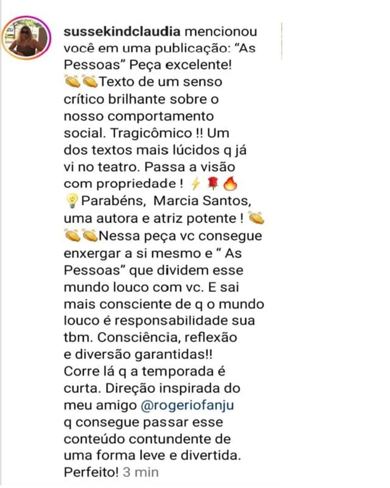 “Eu adorei o espetáculo. Achei a direção do Rogério ótima! A versão final do texto está perfeita. [...] Tem que entrar em cartaz numa temporada maior.”